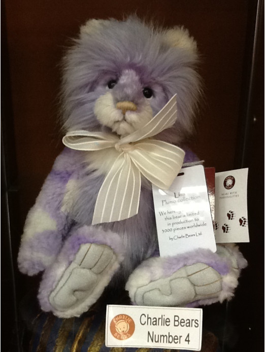 Lisa has really soft, thick lilac fur on her arms and legs and this is mottled with white, so is quite unusual. Long, fluffy lilac fur is on her body and head, which makes a great contrast and this has been gently trimmed around the eyes to show her teardrop markings. The white fluffy muzzle is soft to touch and the big sculpted pads have some airbushing and the golden stitched claws match her hand-stitched nose and mouth. The cream striped bow is the perfect accessory.
