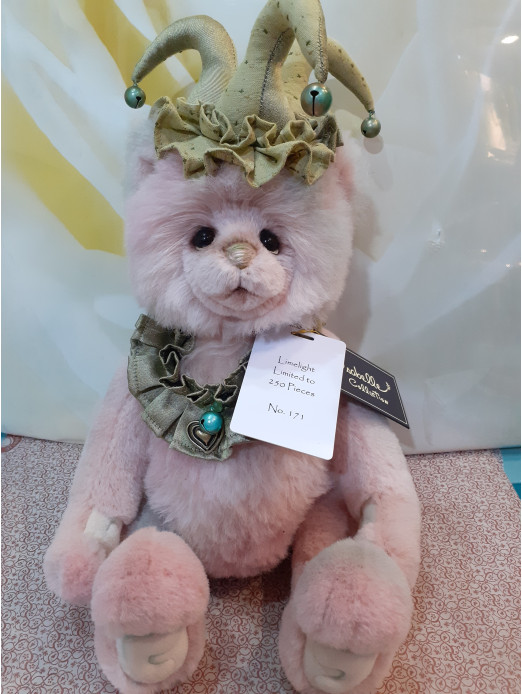 ISABELLE LIMELIGHT is made from delicate pink and white fur that is very soft and dense, so will be great for running your hands through. She has a two-tone hand-stitched nose, light sculpted pads and thoughtful dark eyes. She wouldn't be complete without her ruff collar and magnificent jester hat.