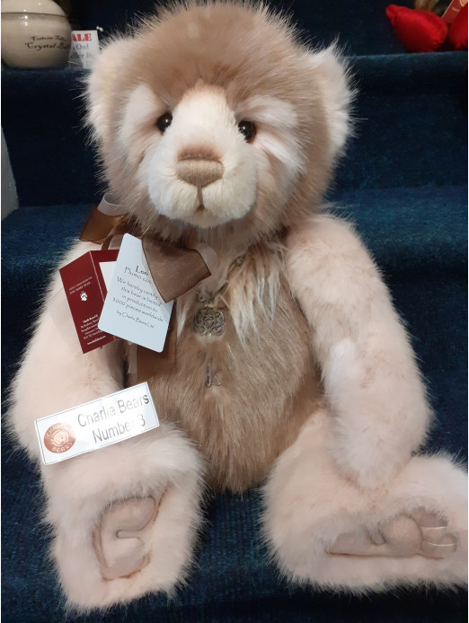 Big gorgeous pastel panda, what more could you want? Lorraine has soft pink plush on her arms, legs, ear backs and her teardrop eye markings. On her body and head she has a muted rust plush that is darker underneath and has longer strands poking out to give her a really full look. As a plumo bear, her muzzle and inner ears are made from alpaca fur and this is cream, except for the bridge of her nose that is made from a soft peach that blends into the plush when it meets her brow.